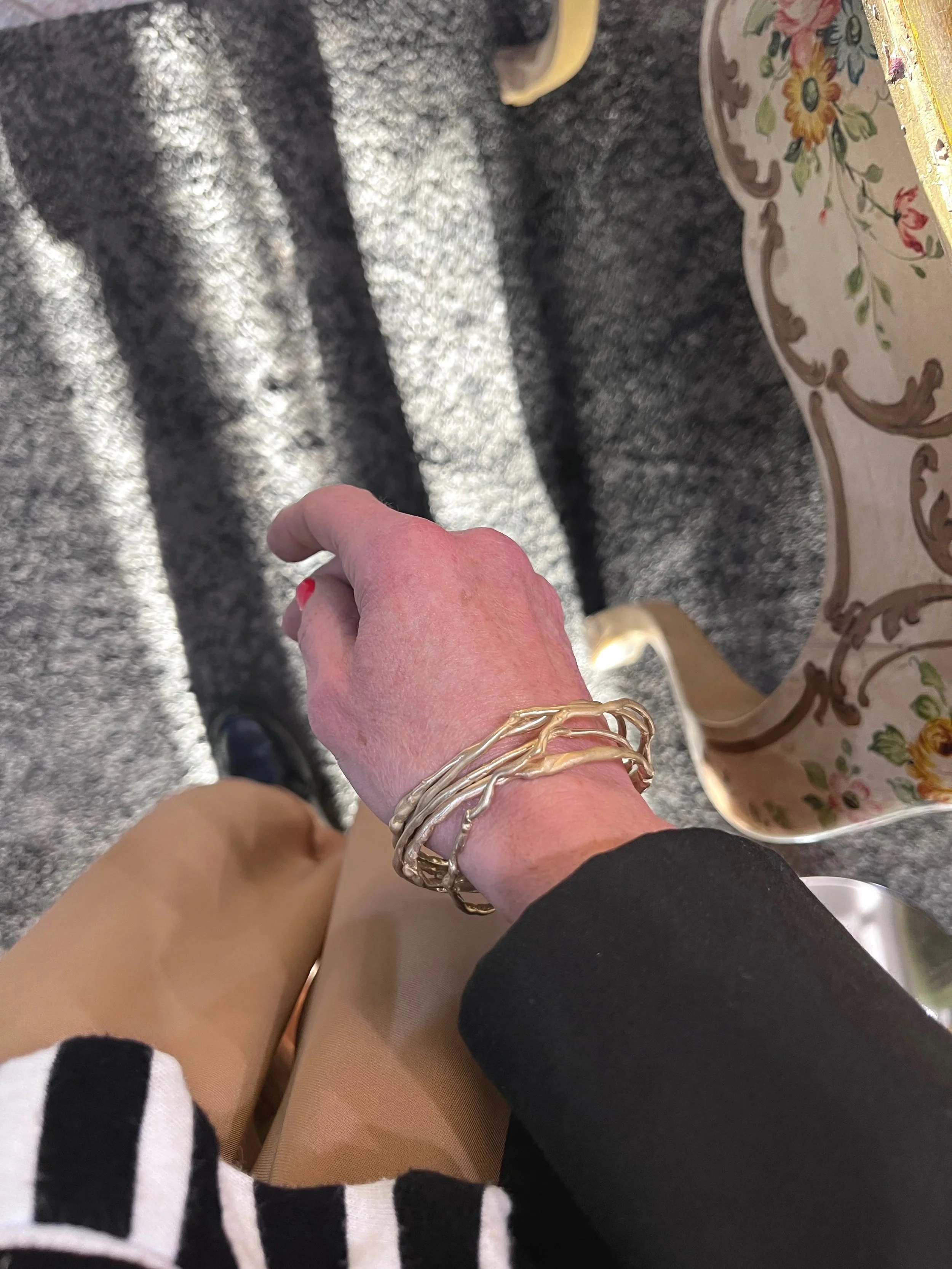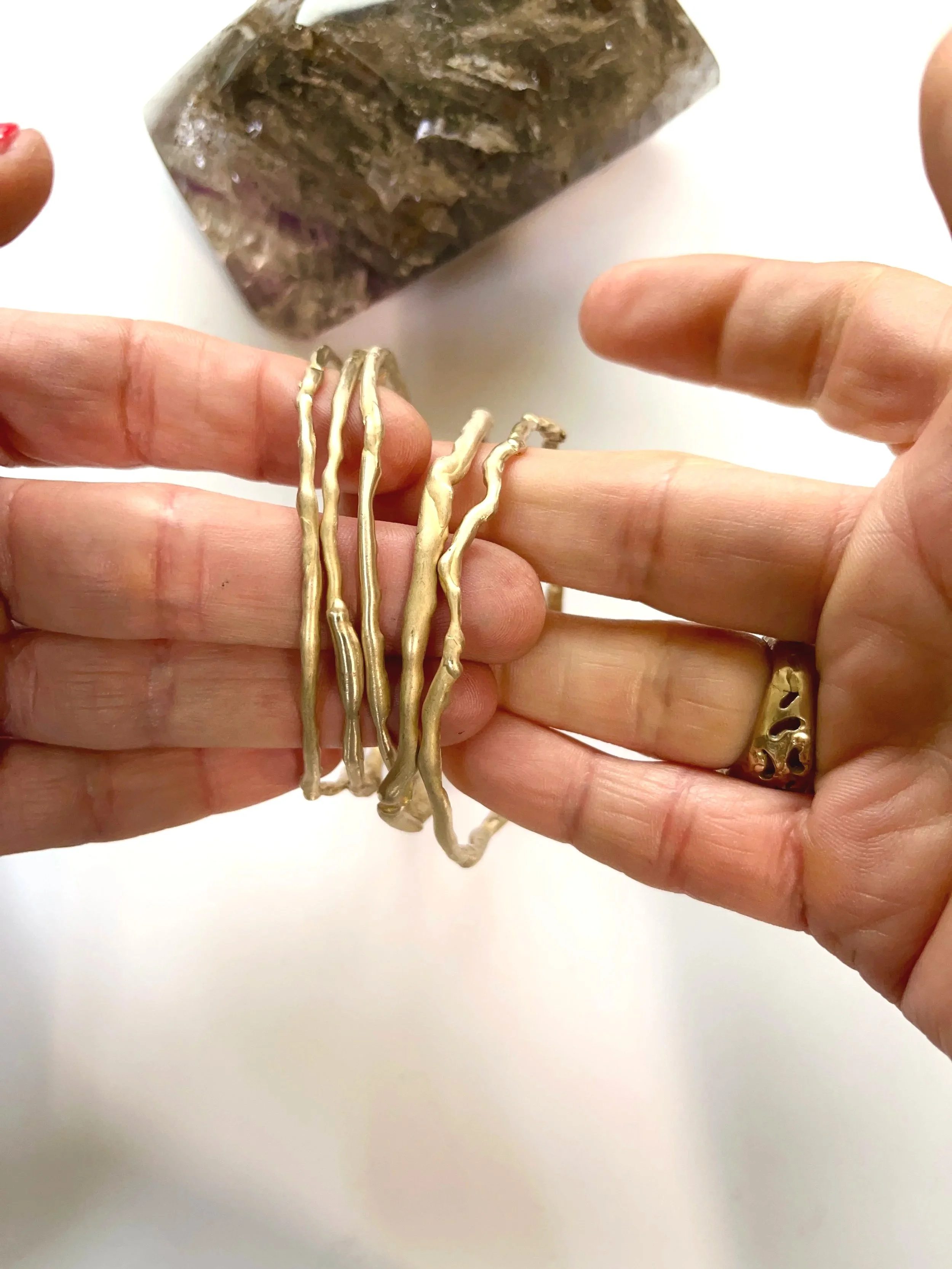 Radici Auree nasce dall’incontro tra materia grezza e gesto artigianale. Il bracciale, in bronzo giallo e pietre naturali e’ stato creato a mano, con una texture organica e irregolare, richiama l’intreccio vivo delle radici: linee che si cercano, si sfiorano e si intrecciano, come sentieri che riportano all’origine.